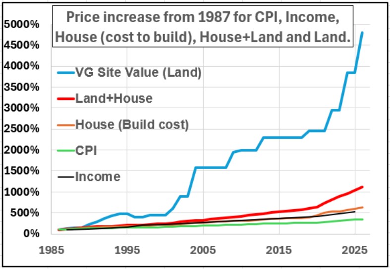 Chart 1 compares the increase in the value of land (State Government annual valuations) with the increases in housing (land + house), house construction costs, income and CPI. This clearly demonstrates that the construction cost of houses is not the problem. Over the last 40 years it increased at about the same rate as income (except for a period after COVID). So the crisis is due to the price of land.