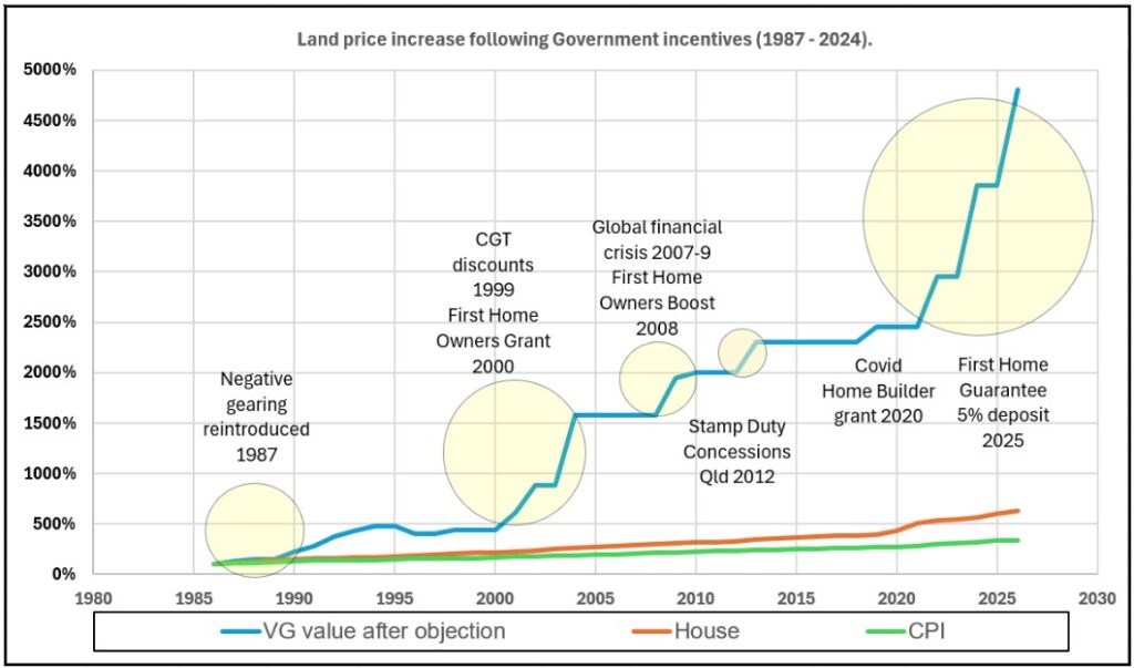 Each state values land at market value regularly for taxation purposes. Chart 2 clearly shows how government incentives, for both investors and for first home buyers, have contributed to the current housing crisis by increasing the price of land.